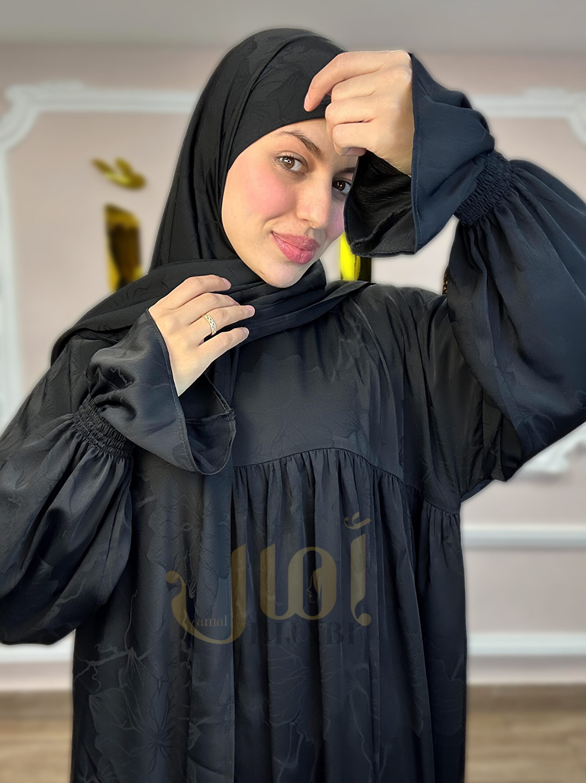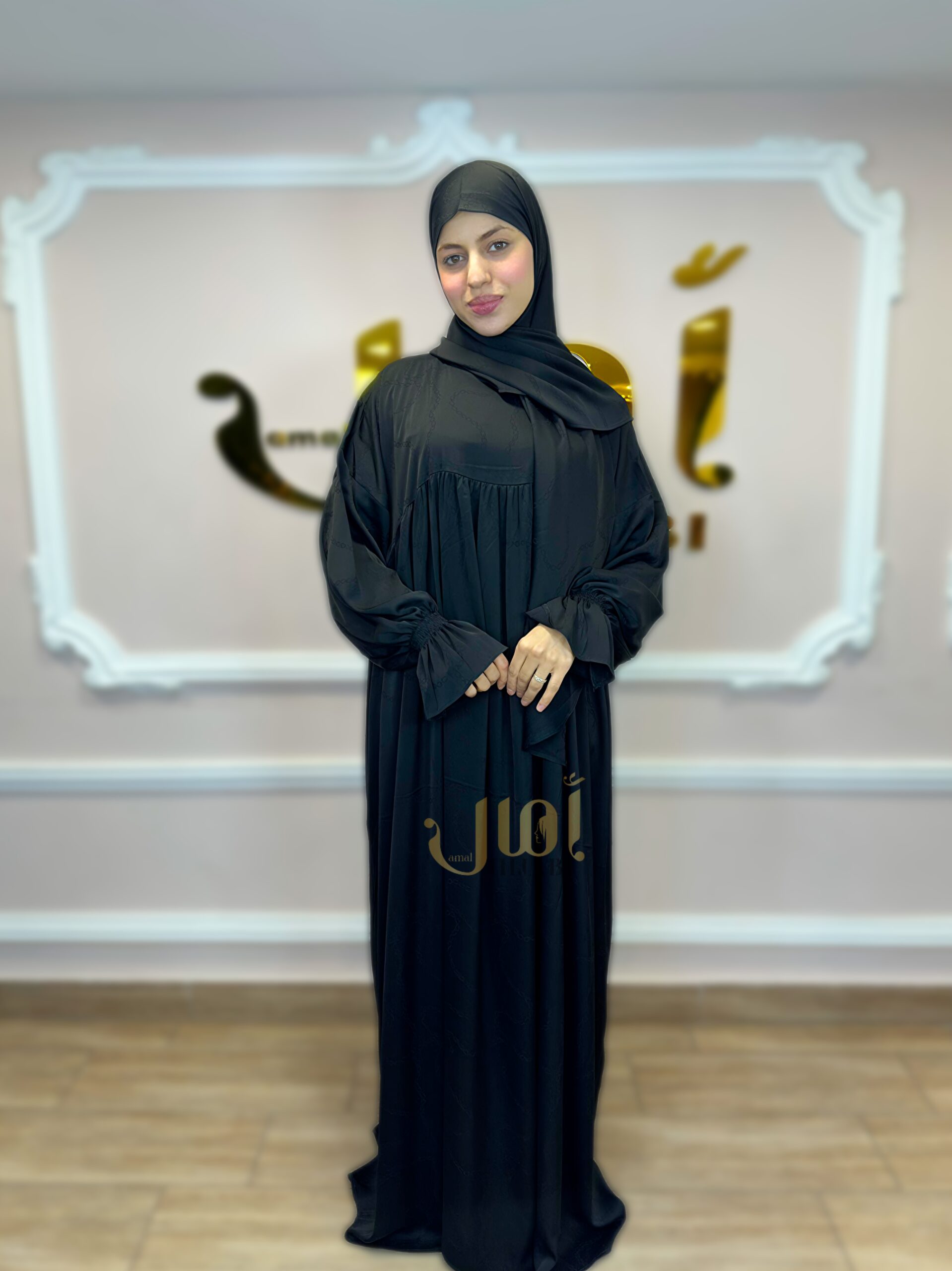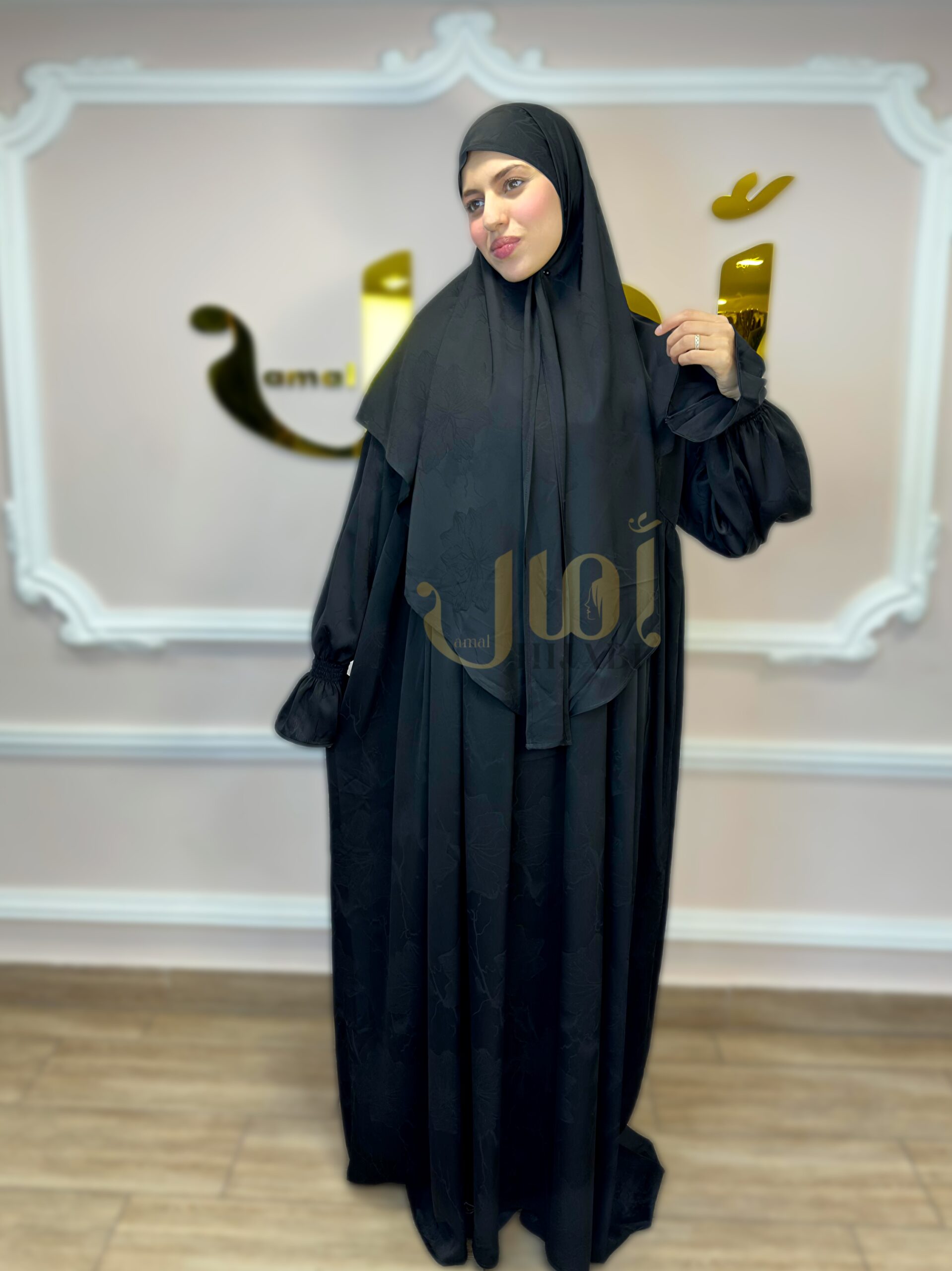 تتميز بخياطة متقنة وتصميم أنيق، وتتكون من قطعتين: العباية وحجاب الرأس المتصل بها، مما يجعلها خيارًا مثاليًا للمناسبات الخاصة واليومية